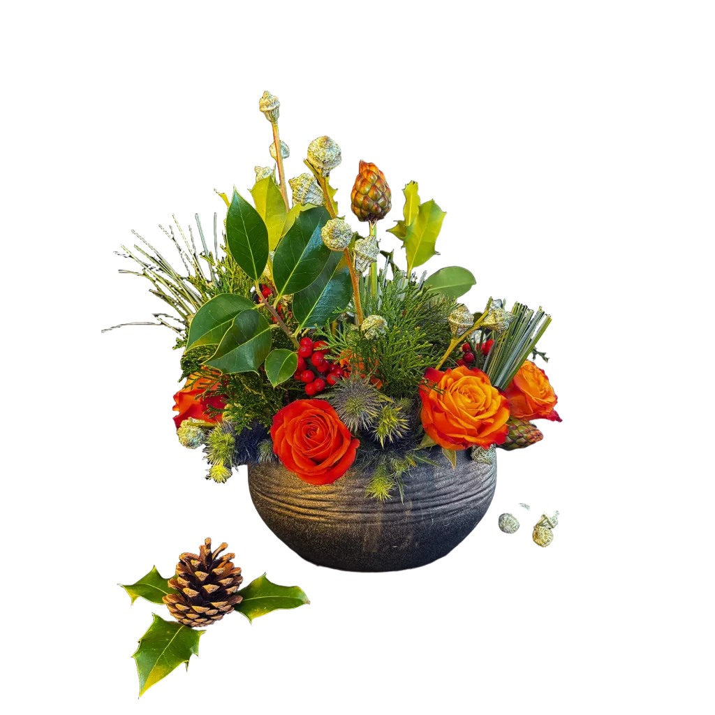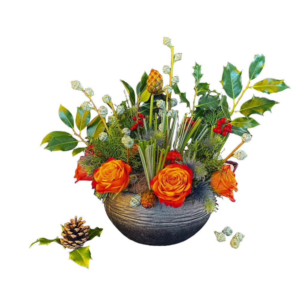 This arrangement stands out for its balance of warm colors and natural textures, creating a vibrant, modern piece with a very elegant winter feel.