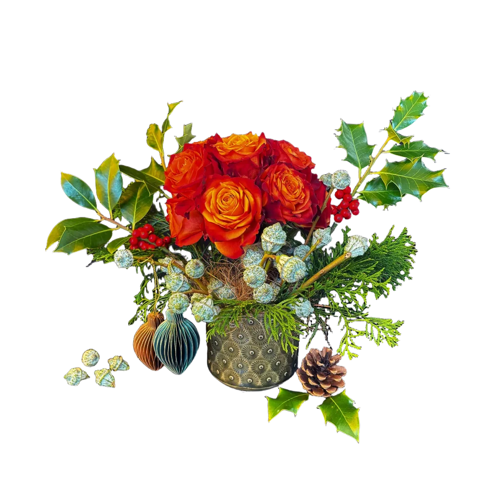 This arrangement blends seasonal greenery with refined botanical accents, creating a fresh, textural composition with a warm, festive character. Its shape is low, abundant, and garden-like, offering a natural yet curated aesthetic.